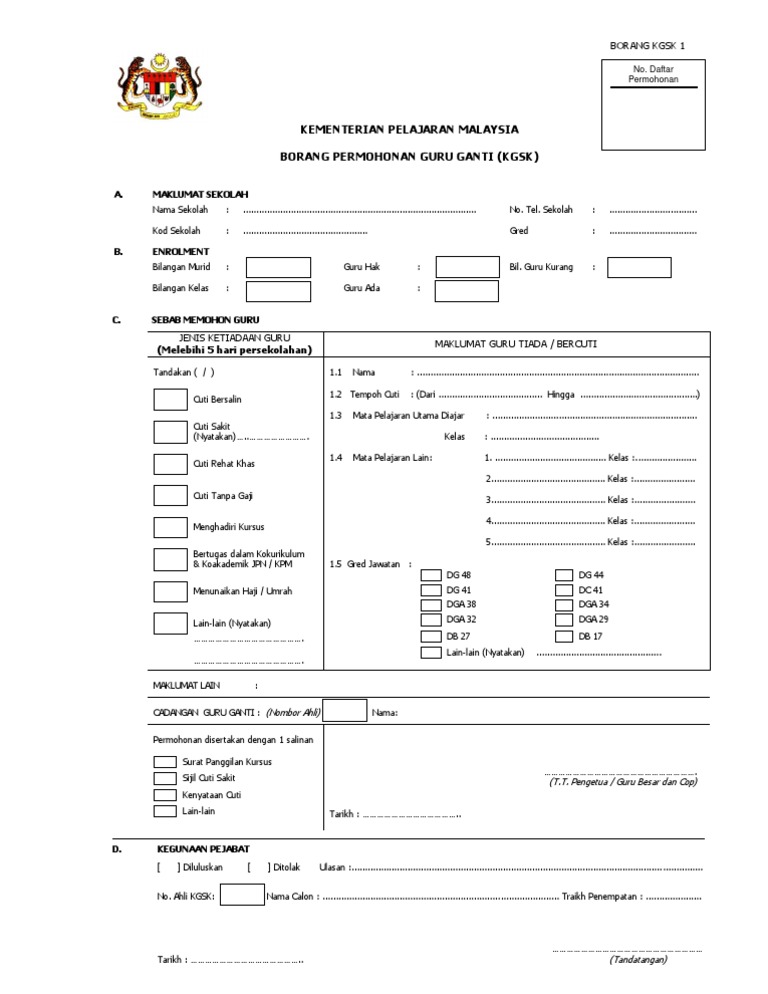 Daftar kementerian pelajaran malaysia borang permohonan sekolah bagi khidmat guru kgsk a. Borang permohonan bagi penempatan di pejabat miti luar negeri. Pemohon hendaklah mempunyai ciri dan menepati syarat permohonan guru tabika kemas seperti yang ditetapkan oleh kemas. Permohonan guru ganti sekolah rendah & menengah 2019 kini dibuka. Permohonan guru ganti 2021 kpm (borang).