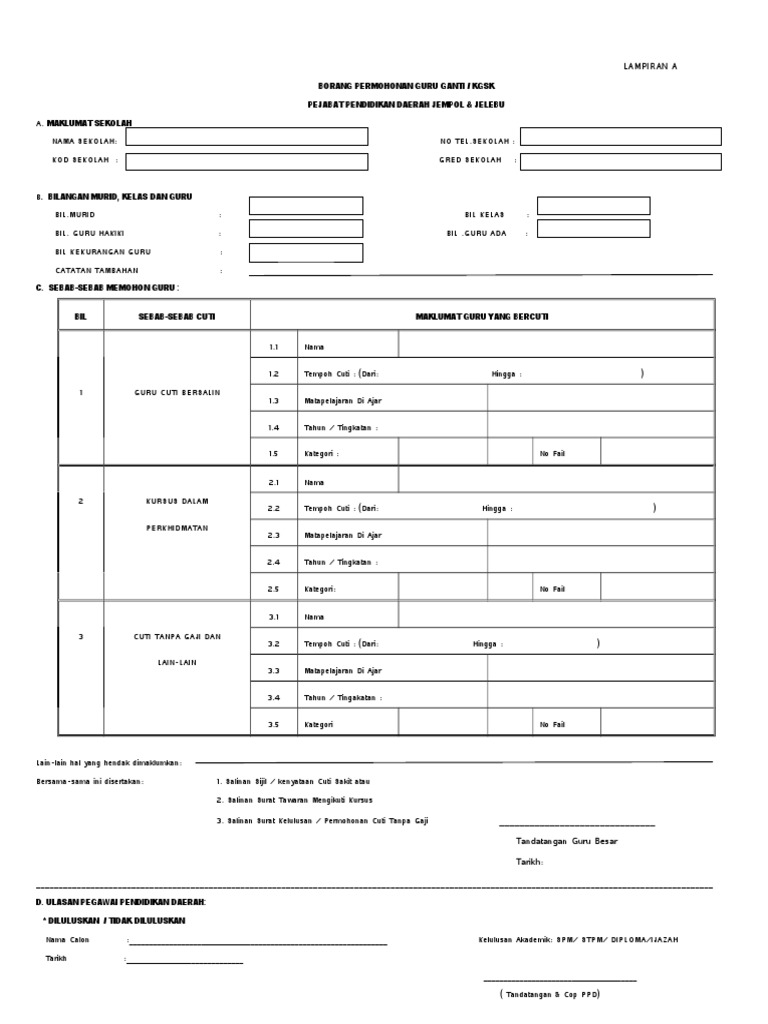 Borang Permohonan Guru Ganti Guru Ganti Adalah Guru Tidak Terlatih Yang Ditempatkan Di Suatu Sekolah Bagi Mengisi Kekosongan Sementara Guru Tetap Disebabkan Cuti Bersalin Cuti Sakit Sekian from demo.fdokumen.site Pdf borang permohonan surat tiada halangan untuk mengikuti pengajian ke luar negara ( pdf, 414 kb ) (342 muat turun). Sedikit perkongsian untuk anda, cara apply permohonan guru jawatan kosong guru ganti merupakan jawatan untuk lepasan spm, stpm, diploma dan ijazah sarjana muda yang tidak memiliki latihan ikhtisas perguruan seperti pismp. Mengisi borang permohonan guru ganti (warna biru) yang boleh didapati di pejabat ppdtl. Jawatan kosong terkini kementerian pendidikan malaysia. Permohonan guru kemas sesi 2021. Pemohon hendaklah mempunyai ciri dan menepati syarat permohonan guru tabika kemas seperti yang ditetapkan oleh kemas. Isi borang permohonan dengan betul dan lengkap seterusnya, isilah borang permohonan anda dengan teliti, lengkap dan tepat. Maklumat terkini pengambilan guru ganti kementerian pendidikan malaysia (kpm) secara online dan syarat kelayakan permohonan.