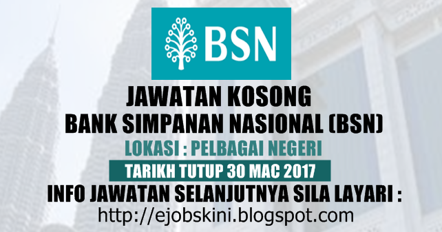 Jawatan Kosong Bsn 2017 - Pelbagai kerja kosong swasta, part time, freelance, full time & internship terkini.. Jawatan kosong kosong terkini di malaysia dari syarikat terpercaya. Jawatan kosong kerajaan 2017, jawatan kosong swasta 2017, jawatan kosong januari 2017, kerja kosong 2017, jobs in malaysia 2017, job vacancy, ohjobs. Jawatan kosong kerajaan dan swasta. Jawatan kosong 2019 terkini ok? Untuk makluman, terdapat beberapa kekosongan jawatan yang dibuka untuk permohonan oleh pihak bank simpanan nasional (bsn).