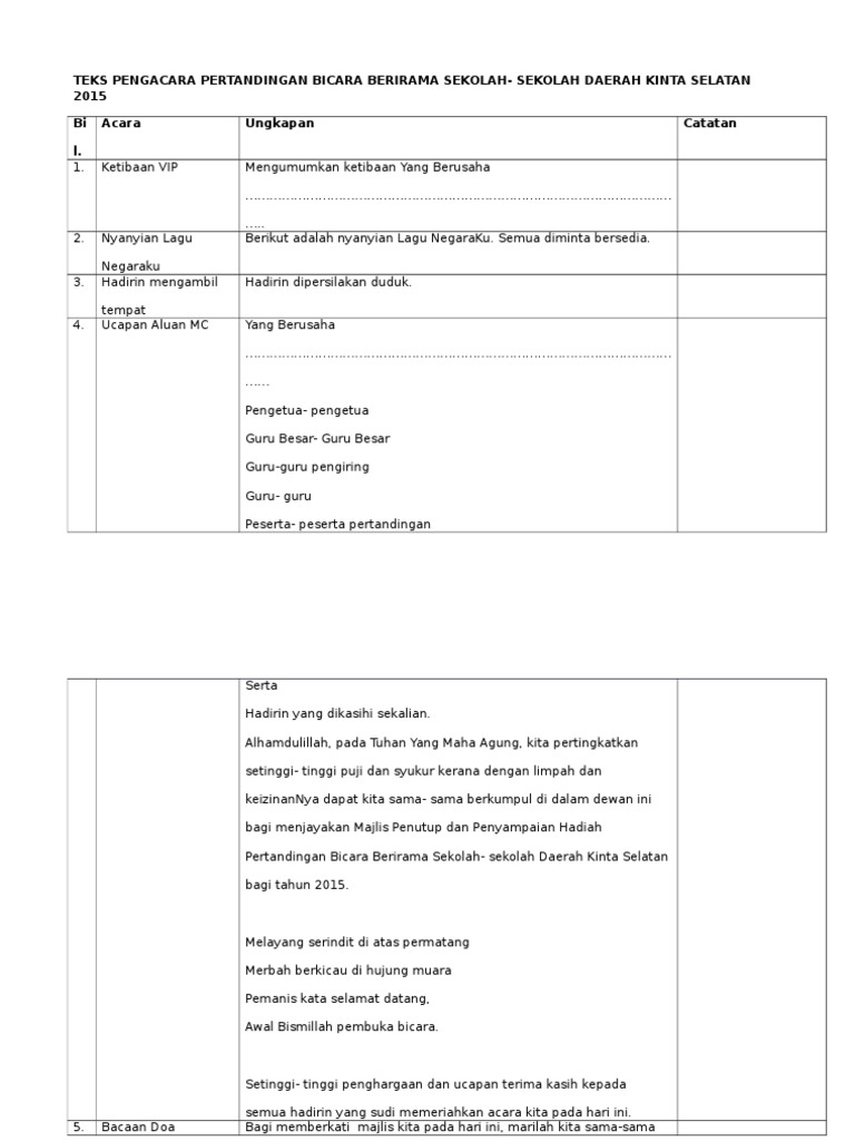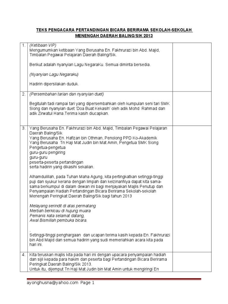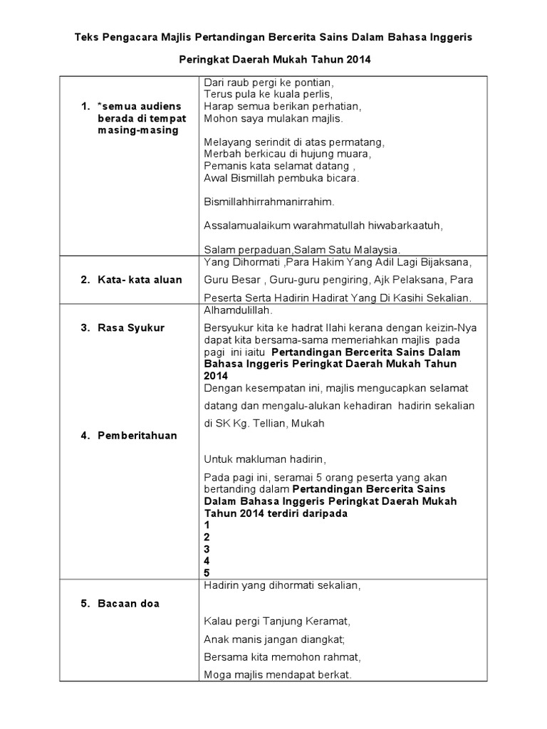 Majlis lambaian rindu sentuhan kasih sempena pertukaran 3orang sahabat kita en. Tuan haji mohd nasarruddin bin ahmad. Masa cue ann 9 12.10 am ucapan yb setelah selesai ucapan yb penyampaian hadiah pertandingan mewarna. Majlis dengan segala hormatnya mempersilakan. Teks pengacara hari pertandingan bercerita. Contoh teks terbaik dan lengkap dari mula program sehingga akhir penutup. Apabila diumumkan ketibaan para tetamu jemputan. Sirih junjung berhias indah, sekacip pinang pembuka kata, bunga manggar kilau bercahaya, datang berkuunnjg ke majlis meriah, sejarah terukir nilai permata, lembaran sejarah kini bermula. Teks pengacara majlis pmr by norazliah ani 3123 views. Majlis dengan segala hormatnya menjemput yang berbahagia dr aiza nur izdihar bt zainal abidin majlis mengucapkan jutaan terima kasih kepada yang berusaha di atas ceramah yang telah disampaikan. Teks pengacara majlis ini kebiasaannya akan berguna untuk persediaan majlis penutupan program tersebut. Biaya perceraian wajib disiapkan oleh pihak yang mengajukan gugatan. Mengumumkan ketibaan yang diraikan en.