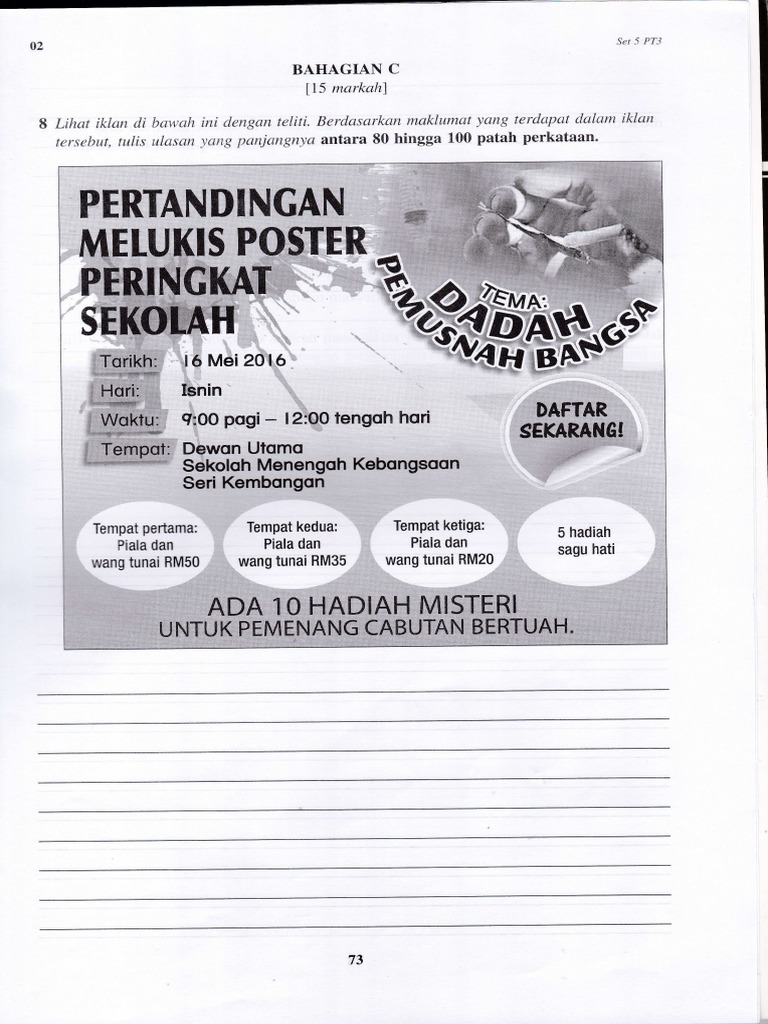 Contoh Ulasan Iklan Pt3 / Sulit 2 Pt3 02 Arahan Jawab Semua Soalan Dalam Bahagian A Bahagian B Bahagian C Dan Satu Soalan Bahagian D Bahagian A 25 Markah Pdf Free Download : Pentaksiran tingkatan tiga atau diperkenalkan dengan nama singkatannya pt3, merupakan sebuah pentaksiran sumatif untuk menilai pencapaian akademik murid pada peringkat menengah rendah.. Upkk, contoh soalan muet, contoh soalan pt3, contoh soalan uksbp, lembaran kerja bahasa melayu tahun 2 via www.slideshare.net. Format dan contoh surat rasmi upsr online. Contoh jawapan bahasa melayu penulisan upsr: Contoh karangan bahasa inggeris pt3 (example essay) via mypt3.com. Lihat gambar di bawah dengan teliti.